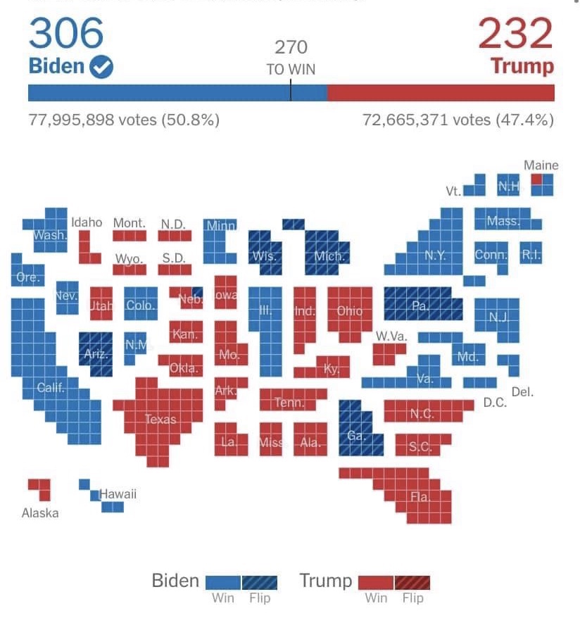This map of the 2020 election resizes the states to reflect their number of electoral votes.